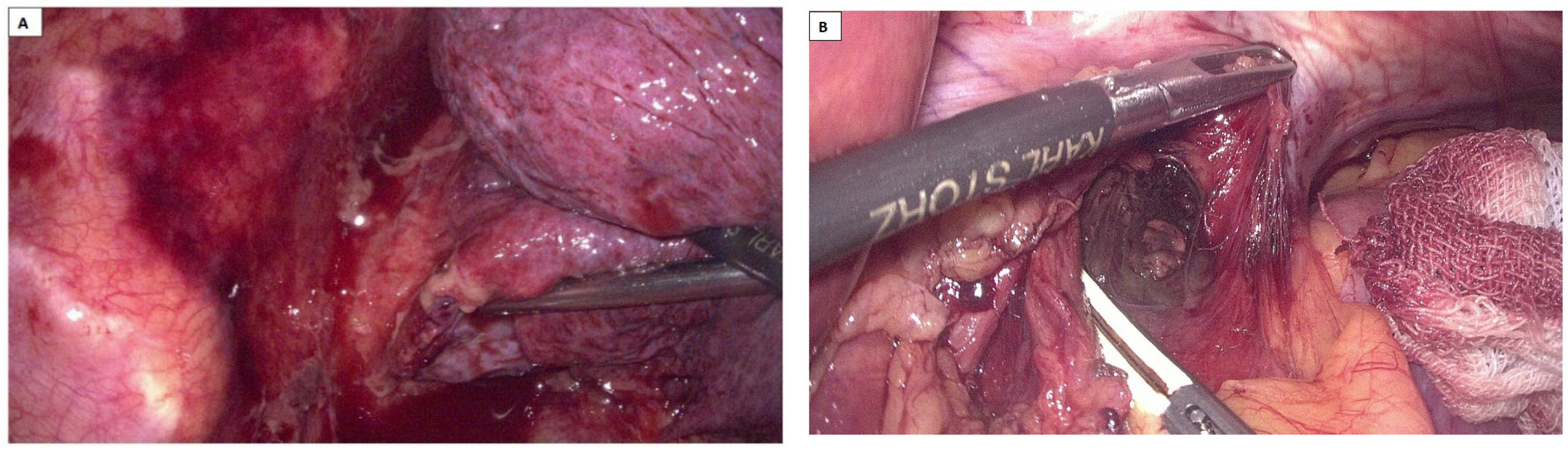 - In the fifth case, a combined approach was used—endoscopical (stenting) and surgical (thoraco-laparoscopic) interventions performed in the same therapeutic session, a so-called “rendez-vous” procedure.