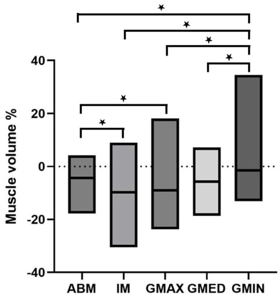 Loss of muscle volume in patients with a decrease in BMI. There was a significant loss of volume detectable in all muscles, except for the M. gluteus minimus. Significant differences of loss of volume between different muscles was calculated by Mann–Whitney test (highlighted by asterisk) and significance level was determined as p < 0.05.