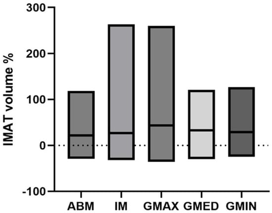 Patients with an increase in BMI showed an increase in intramuscular adipose tissue at T2 (Table 3), which was observed in all muscles. There were no significant differences in IMAT increase between the selected muscles: iliopsoas muscle (median +27.0%, IQR 1.4–62.5%), M. gluteus max. (median +43.6%, IQR 20.0–91.2%), M. gluteus med. (median +32.8%, IQR 12.3–70.6%), autochthonous back muscles (median +22.0%, IQR 4.6–46.0%) and M. gluteus min. (median +29.2%, IQR 10.2–51.8%) (Figure 4).