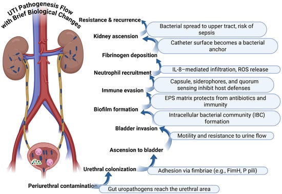 Figure 1. Stepwise pathogenesis of UTIs with associated biological changes [15,16,21].