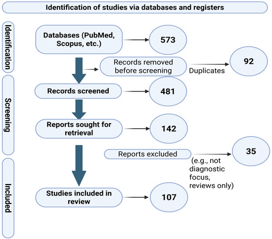 Figure 2. PRISMA flow diagram summarizing the literature selection process. The diagram specifies the exact number of records identified from each database, the number of duplicates removed, and the reasons for exclusion of 35 reports (e.g., n = 18 without diagnostic focus, n = 9 narrative reviews, n = 8 animal studies).