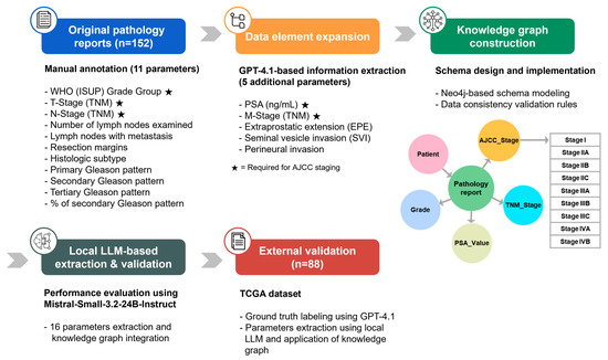 Most pathology reports are written in free-text format [9,10], which poses significant challenges for information extraction and clinical decision support. Large language models (LLMs) have demonstrated significant advances in medical applications [11,12], including information extraction from electronic health records [13], clinical text summarization [14], and document classification [15]. Prompt engineering utilizing LLMs enables the extraction of structured information from narrative pathology reports without requiring manual annotation or model training [10,16]. Medical knowledge graphs systematically represent information by organizing medical concepts and events as nodes and edges to describe their interrelationships [17]. This study aims to develop an automated AJCC staging system for RP pathology reports by applying prompt engineering with LLMs for information extraction and knowledge graph-based approaches for validation and staging classification. Specifically, key pathological information is extracted from free-text reports, a knowledge graph is constructed from the extracted data, and rule-based AJCC staging is implemented with integrated data consistency verification.
