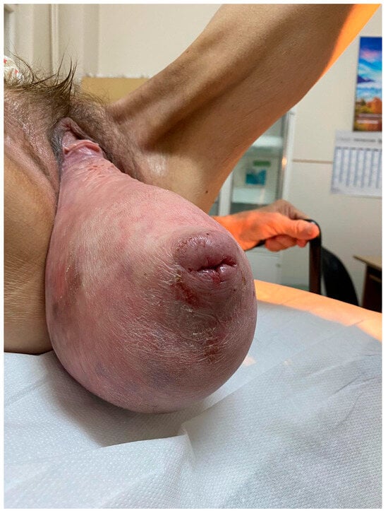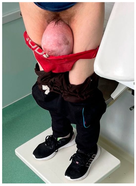 We report a rare case of a 48-year-old woman, declaratively without any pregnancy or surgical history and no known medical conditions at the time of the first medical presentation, apart from chronic kidney disease that was later discovered. She came to our medical unit complaining of abdominal pain, vaginal bleeding and significant urinary incontinence. Based on the clinical examination, the patient was diagnosed with severe grade IV POP, according to the Baden–Walker (Halfway) staging system [15,16]. The appearance of the patient at the initial presentation is demonstrated in Figure 1 and Figure 2.
