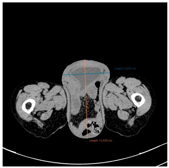 Computed tomography (CT) scans of the abdomen and pelvis (Figure 3 and Figure 4) revealed a large perineal hernia containing the uterus, urinary bladder and small bowel loops—an extremely rare finding, with only isolated cases reported in the medical literature.