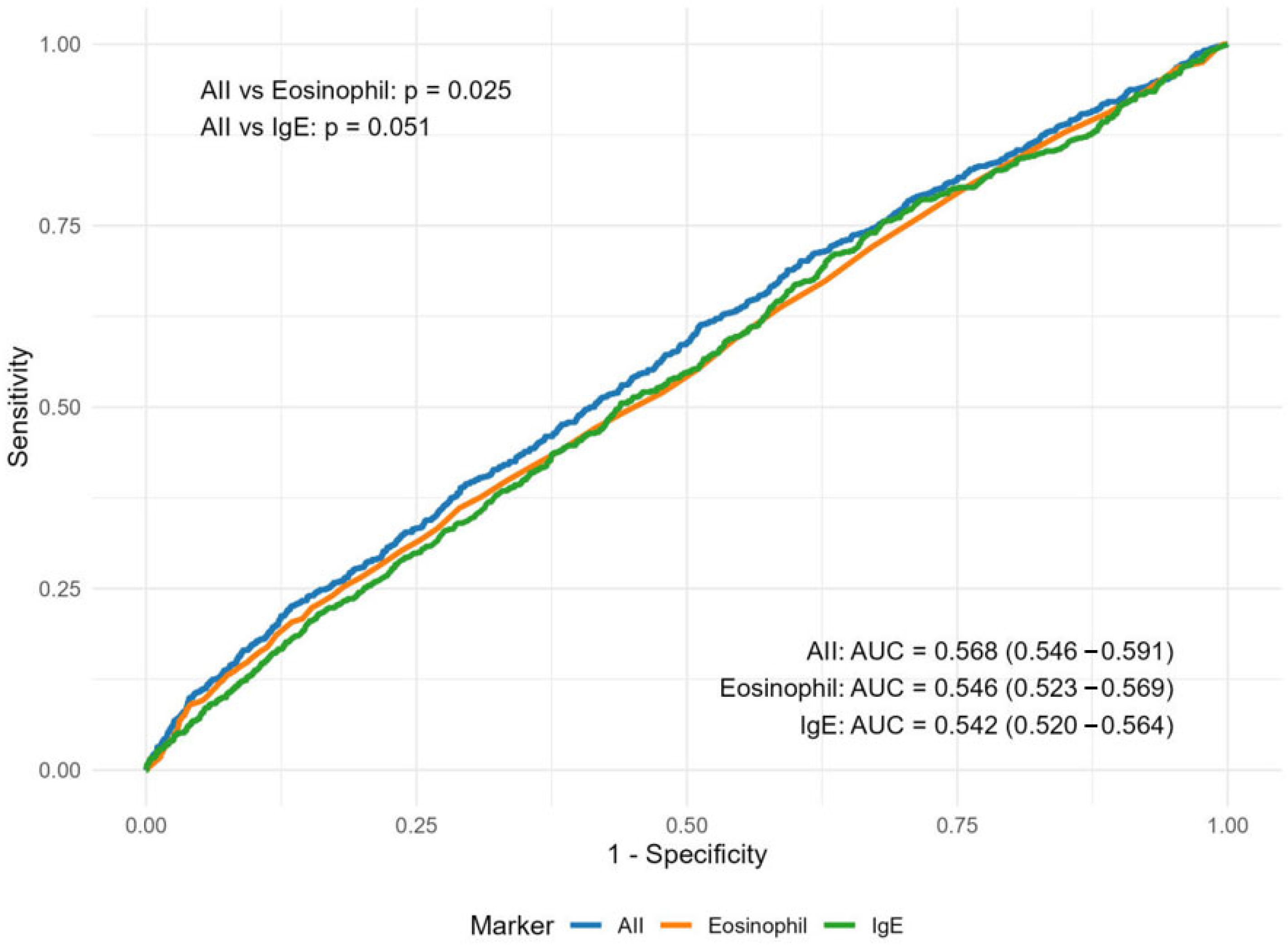 Eosinophil | 0.17 (0.11, 0.27) | 0.17 (0.11, 0.27) | 0.18 (0.12, 0.28) | Z = −1.54 | 0.125 |
