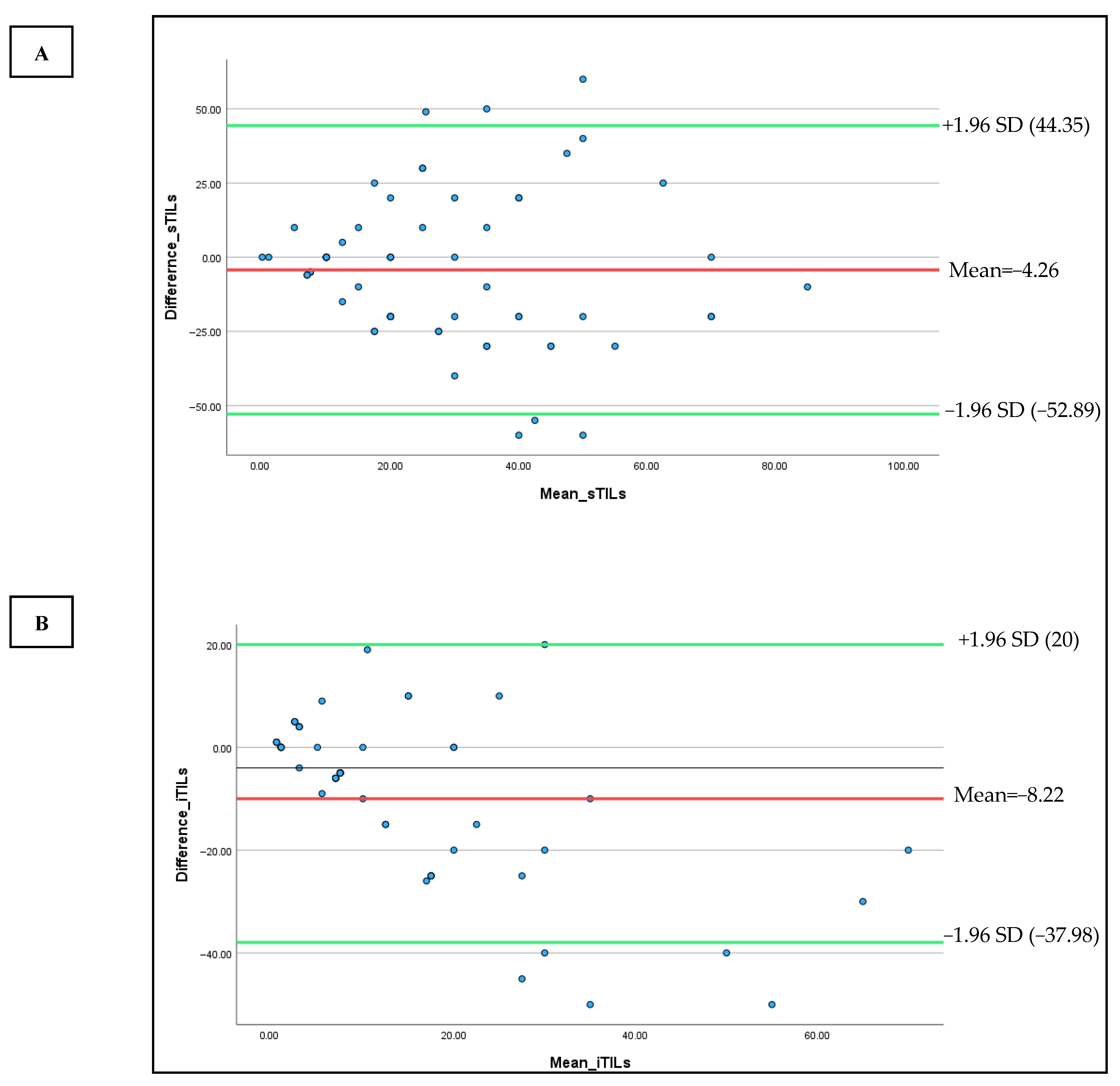 To visualize the discordance among pathologists based on the sTIL and iTIL density scores, Bland–Altman plots were drawn (Figure 2A,B). Bland–Altman plots were constructed to visualize scoring variability. For sTILs, the mean difference between observers was −4.26, with wide limits of agreement (−52.89 to +44.35), indicating moderate to high variability, particularly at higher densities. For iTILs, the mean difference was −8.22 with narrower limits of agreement (−37.98 to +20), reflecting relatively better consistency (Figure 2).