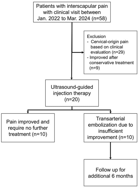 Between January 2022 and March 2024, 58 consecutive patients with moderate-to-severe interscapular pain [Numeric Rating Scale (NRS) ≥ 5] persisting for more than 3 months presented to our clinic. Of these, 29 patients were excluded due to suspected cervical-origin pain based on clinical and imaging evaluation and were directed to alternative treatments. Among the remaining 29 patients, nine achieved satisfactory pain relief with conservative management. The other 20 patients proceeded to ultrasound-guided injection therapy. After 3 months of follow-up, 10 patients showed inadequate pain relief and subsequently underwent TAE, whereas the other 10 experienced substantial and sustained pain relief without further intervention. Thus, 10 patients treated with TAE and 10 patients who responded to injection therapy were included in the final analysis. Consistent with a feasibility study, the target sample reflected consecutive availability and procedural practicality rather than formal power calculations. The treatment algorithm and patient selection process are summarized in Figure 1.