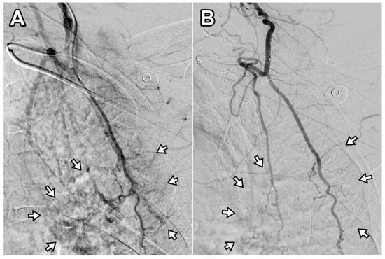 Embolization was performed using a mixture of imipenem/cilastatin sodium (IPM/CS, 500 mg suspended in 10 mL of iodinated contrast), delivered in 0.5–1 mL increments until transient stasis of antegrade blood flow was achieved for 3–5 heartbeats in the target vessel. Typically, 2–5 mL of the IPM/CS mixture were required to reach the treatment endpoint. Following the procedure, the catheter and introducer sheath were removed, and hemostasis was achieved via manual compression or a radial compression device (TR Band, Terumo, Tokyo, Japan).