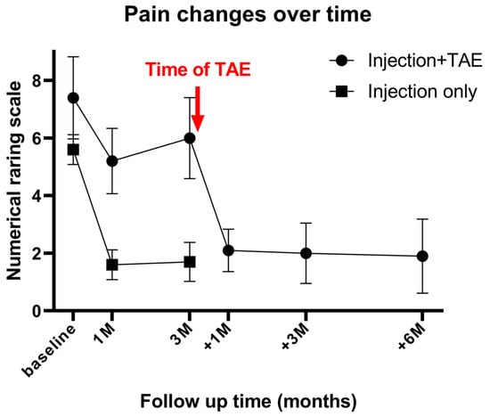 Mean numerical rating scale (NRS) scores over time in patients receiving ultrasound-guided injection only (n = 10) and in patients who underwent injection followed by subsequent transarterial embolization (TAE) (n = 10). The red arrow indicates the timing of TAE in the latter group. Baseline, 1M, and 3M denote 1 and 3 months after injection; +1M, +3M, and +6M denote 1, 3, and 6 months after TAE. M = month. Patients with inadequate response to injection therapy demonstrated significant pain reduction after TAE, which was sustained for up to 6 months.