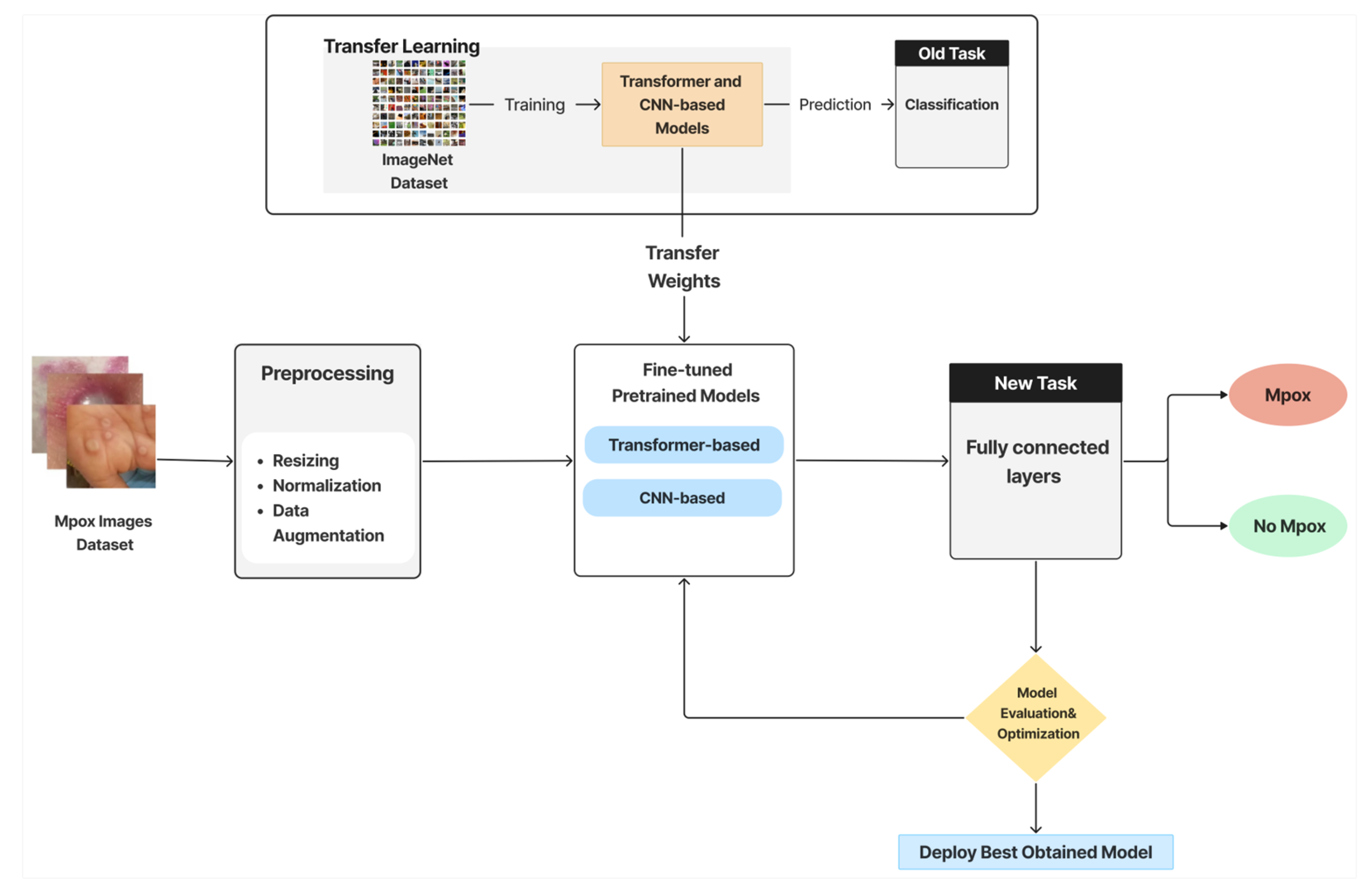 - DL-Based Image Classification: The preprocessed image is fed into a fine-tuned DL model based on pretrained vision transformers or CNN, which predicts the likelihood of Mpox infection (binary or multiclass).