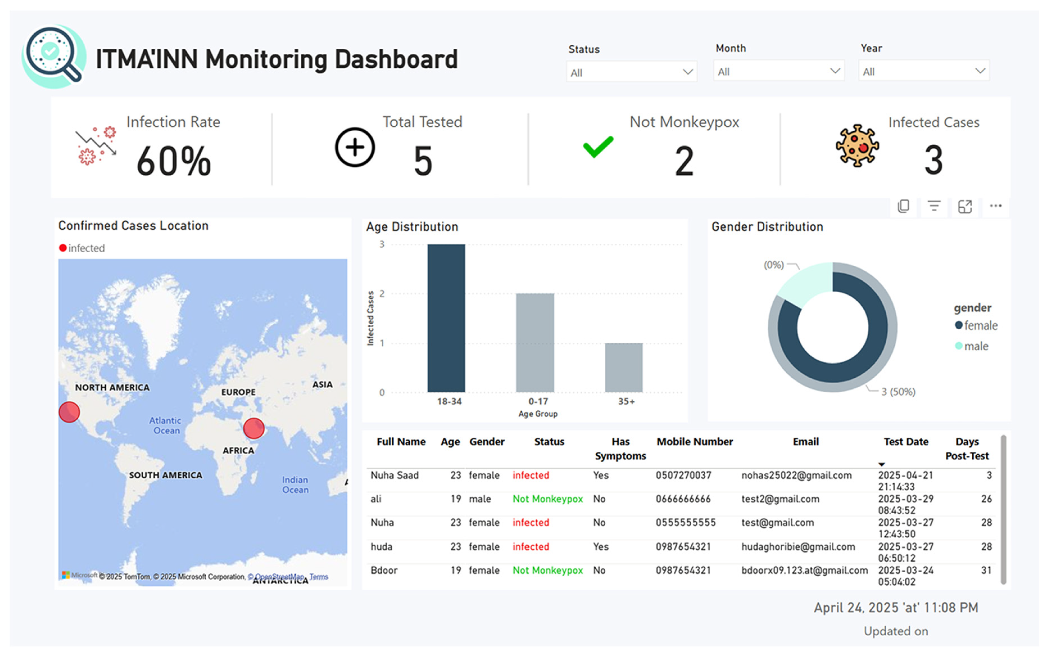 - Health Authority Dashboard: A real-time dashboard, synchronized with the app database, allows public health authorities to monitor Mpox case trends, track geographic spread, and support timely interventions.
