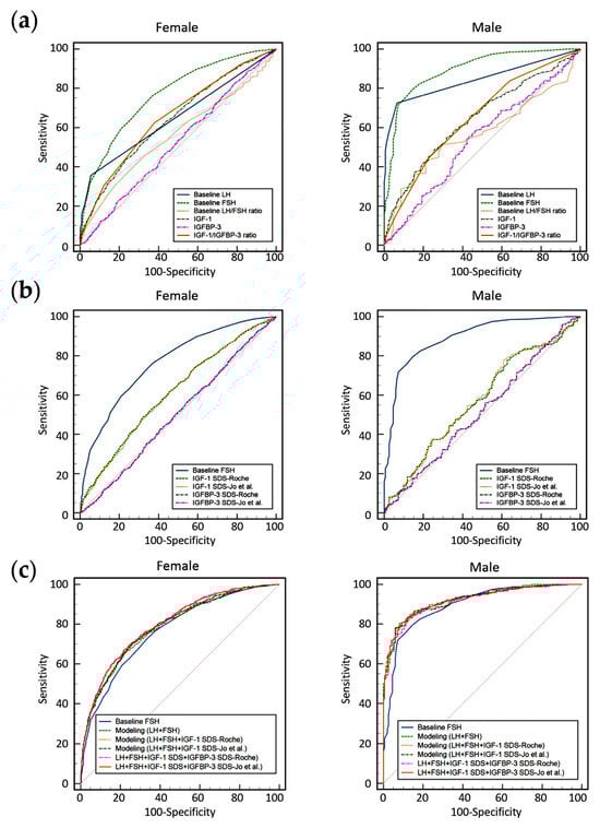 Receiver operating characteristic (ROC) curves for predicting central precocious puberty (CPP), stratified by sex (left: female; right: male). (a) ROC curves based on raw values of baseline LH, baseline FSH, baseline LH/FSH ratio, IGF-1, IGFBP-3, and the IGF-1/IGFBP-3 ratio. (b) ROC curves based on SDS values for IGF-1 and IGFBP-3, calculated using two different reference interval sources (Roche manufacturer’s instructions for use and Jo et al.), compared with baseline FSH. (c) ROC curves for sex-specific predictive models derived from multivariable logistic regression incorporating age, sex, baseline LH, baseline FSH, and SDS values of IGF-1 and IGFBP-3, using reference intervals provided by Roche and the study by Jo et al. [10], compared with baseline FSH alone.