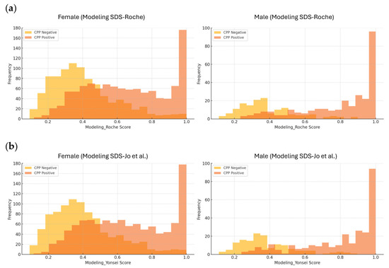 Histograms of predictive scores derived from models based on LH, FSH, IGF-1 SDS, and IGFBP-3 SDS. Histograms showing the distribution of predictive scores for central precocious puberty (CPP), stratified by sex and CPP status. (a) Predictive scores from the model using SDS values based on reference intervals provided by Roche. (b) Predictive scores from the model using SDS values based on reference intervals from the study by Jo et al. [10]. Different y-axis upper limits were applied for females and males, as the larger number of female patients caused the male bars to appear too small when a uniform scale (180) was used.