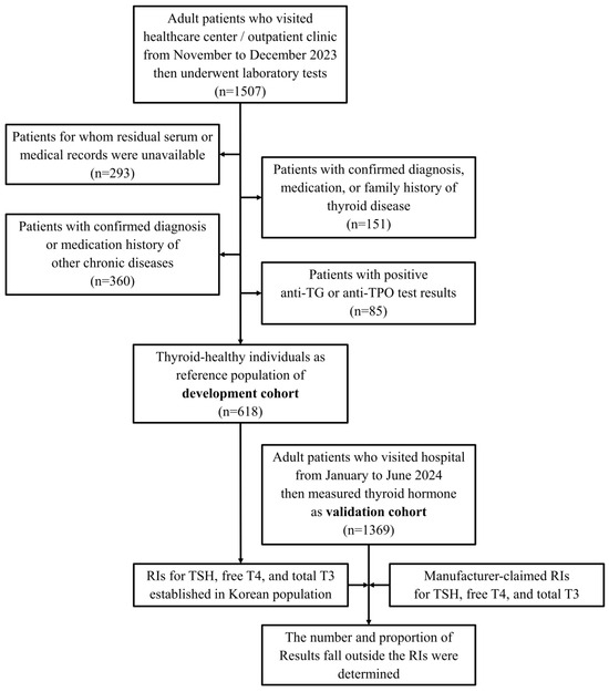 Flow of the study. The RIs for thyroid hormones were established by reference values obtained from development cohort; then, the changes in the number and proportion of results falling outside the RIs in validation cohort were investigated.