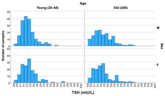 Distribution of TSH value in each subgroup. The number of samples with TSH levels divided by a range of 0.5 mIU/L intervals for each subgroup is presented in the histogram above. Three samples with values higher than 10.0 mIU/L were omitted for readability. Higher distributions than the manufacturer-claimed RIs were observed in all subgroups. Abbreviations: F, female; M, male; TSH, thyroid-stimulating hormone.