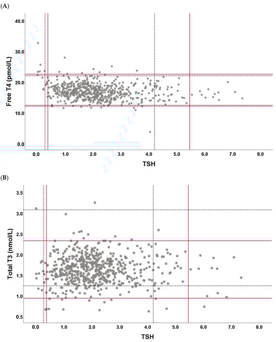 TSH, FT4, and TT3 reference values and established/manufacturer-claimed reference intervals. In the scatter plot above, each dot represents the reference values for TSH, (A) FT4, and (B) TT3, with the dotted line indicating the manufacturer-claimed reference limits and the solid red line indicating the reference limits established in this study. The shift in the upper reference limits for TSH and lower upper limits for TT3 is visualized.