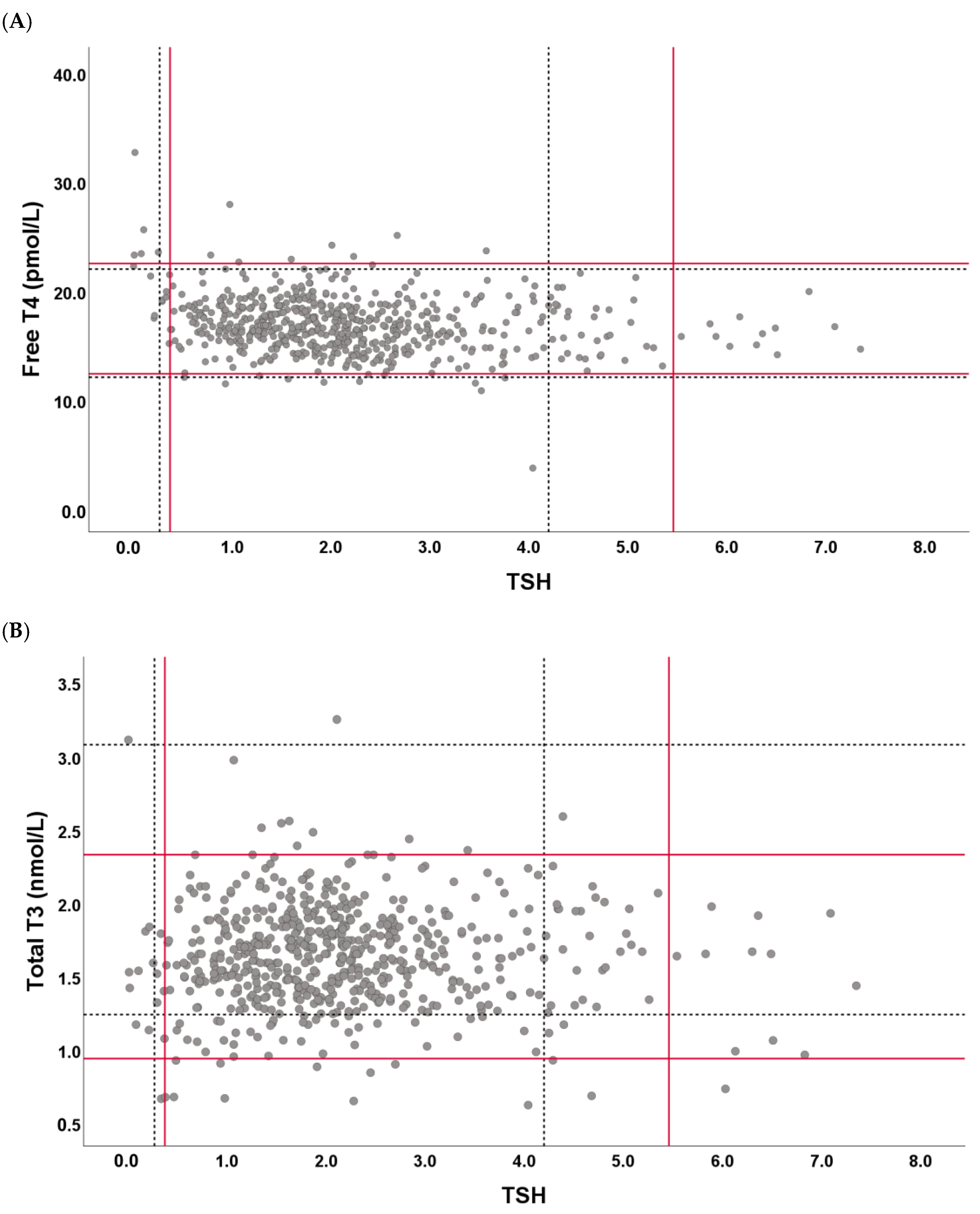 Figure 3. TSH, FT4, and TT3 reference values and established/manufacturer-claimed reference intervals. In the scatter plot above, each dot represents the reference values for TSH, (A) FT4, and (B) TT3, with the dotted line indicating the manufacturer-claimed reference limits and the solid red line indicating the reference limits established in this study. The shift in the upper reference limits for TSH and lower upper limits for TT3 is visualized.