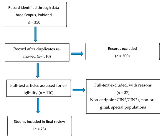 The search yielded a total of 350 articles, identified through major scientific databases (PubMed, Scopus). After removing duplicates (40) and an initial screening of titles and abstracts (200), 110 articles remained, fully assessed in full text. Of these, 73 were included in the final qualitative review. The analyzed corpus included prospective and retrospective observational studies, systematic reviews, and meta-analyses, as well as official international clinical guideline documents, selected to represent current management and the most up-to-date evidence on cervical intraepithelial neoplasia grade 2 (CIN2). Summary of included studies (n = 73).