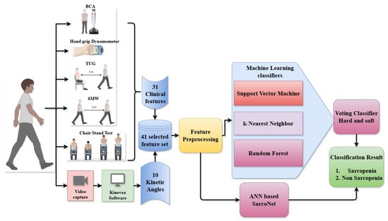 Figure 1 depicts the detailed architecture of the proposed sarcopenia classification framework, which integrates clinical evaluations and video-based motion analysis, ML classifiers, and ANN-based SarcoNet. The system has been developed to process and analyse an entire set of 41 features to distinguish sarcopenic from non-sarcopenic individuals. The workflow begins with data collection from two distinct sources: clinical tests and gait video analysis. Thirty-one clinical parameters are derived from widely accepted sarcopenia assessment tools, including bioelectrical impedance analysis (BIA), Hand Grip Strength using a dynamometer, the Timed Up and Go (TUG) test, the Six-Metre Walk (6 MW) test, and the Chair Stand Test. These features demonstrate basic functional attributes as muscle strength, mobility, balance, and endurance. At the same time, real-time recordings of individuals’ gaits are made as they walk on different types of terrain. Kinovea software (version 2023.1.2) is used to examine this video and estimate 10 kinetic angles. These include the maximum joint angles of knee flexion, knee extension, ankle plantarflexion, and ankle dorsiflexion during crucial gait phases.