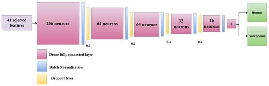 The proposed study designs an ANN-based model, SarcoNet, for the prediction of Sarcopenic patients based on the 41 features integrated from clinical and kinetic characteristics. As shown in Figure 2, the network architecture has six fully connected (dense) layers, interleaved with batch normalisation and dropout layers to accelerate learning and prevent overfitting.