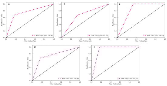 ROC curve obtained from utilised ML classifiers: (a) SVM, (b) k-NN, (c) RF, (d) Voting classifier—hard, and (e) Voting classifier—soft.