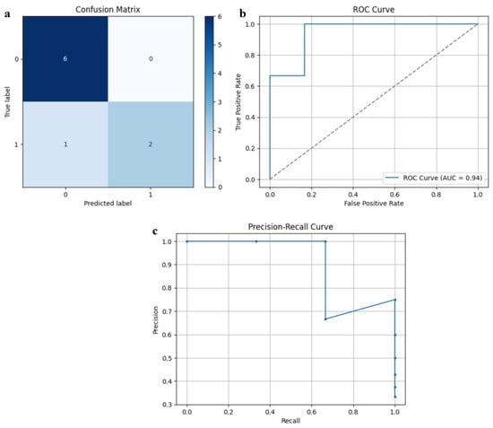 Testing performance of SarcoNet: (a) Confusion matrix, (b) ROC curve, and (c) Precision–Recall curve.