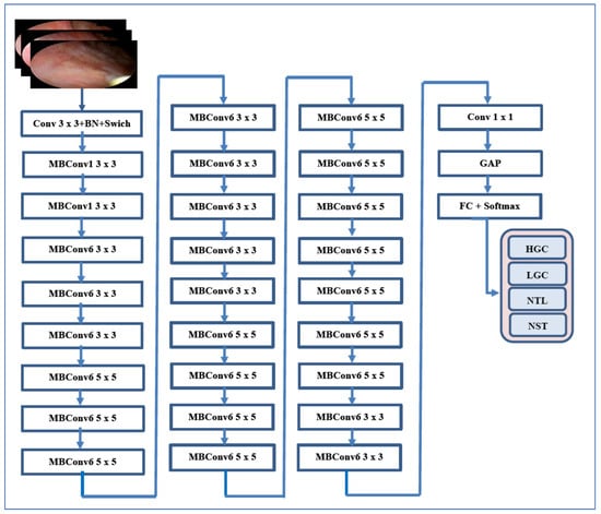 EfficientNet-B3 has been successfully utilized in endoscopic bladder tissue classification, especially with the public EBTC dataset. Studies have employed EfficientNet-B3 for feature extraction, followed by traditional classifiers (like SVM and KNN), or have fine-tuned it end-to-end on histopathological and cystoscopic images. Its capability to capture subtle textural differences between healthy and cancerous tissue—particularly in Narrow Band Imaging (NBI) and White Light Imaging (WLI) endoscopy—makes it highly effective for detecting both low- and high-grade bladder carcinoma. Figure 2 for an illustration of EfficientNet-B3’s architecture [22].