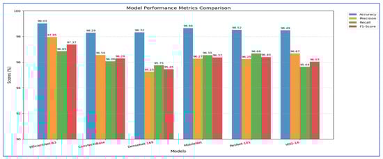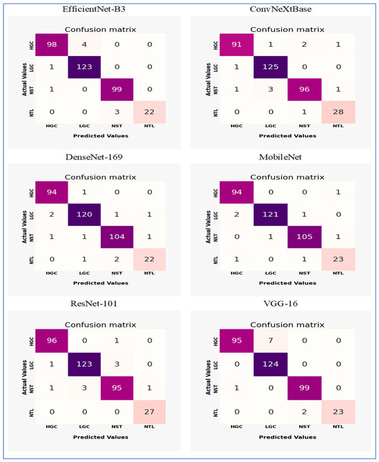The effectiveness of the six DL models—EfficientNet-B3, ConvNeXtBase, DenseNet-169, MobileNet, ResNet-101, and VGG-16—was evaluated using the formulas presented in Equations (1)–(7).