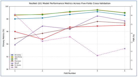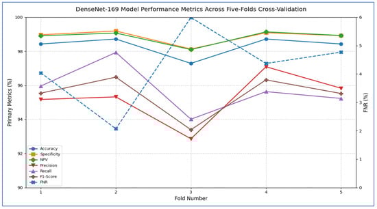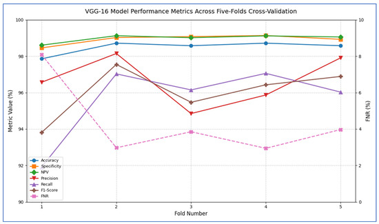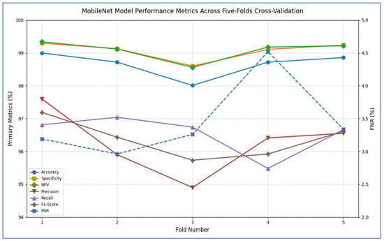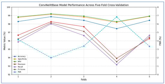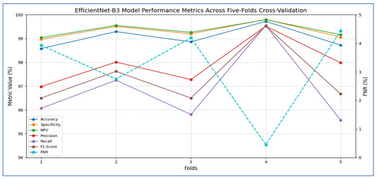 Via the five-fold cross-validation, the EfficientNet-B3 achieved an accuracy between 98.58% and 99.72% (mean 99.03%) and a specificity from 98.97% to 99.80% (mean 99.31%), indicating exceptional discrimination of healthy cases. Its FNR varied from 0.45% to 4.43% (mean 3.15%), while the NPR value ranged from 99.04% to 99.79% (mean 99.36%), showing that negative predictions were almost always correct. Positive predictive value spanned 96.98% to 99.52% (mean 97.95%), and sensitivity ranged from 95.57% to 99.55% (mean 96.85%), with the F1-score balancing these at 96.50–99.53% (mean 97.37%). Overall, the model demonstrated outstanding specificity and precision, a low FNR, and robust accuracy, with only minor variability in recall across folds.