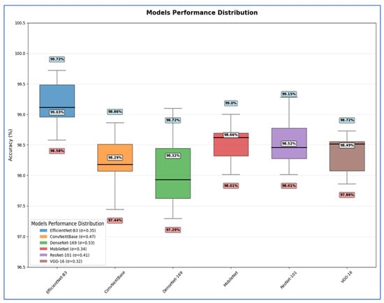 Moreover, we implemented the paired t-test as shown in Table 14. From Table 14, the performance of different models was compared against the baseline model, EfficientNet-B3, which achieved an accuracy of 99.03%. All other models showed lower accuracy values. ConvNeXtBase reached 98.29%, representing a difference of −0.74%, and the difference was statistically significant. DenseNet-169 obtained an accuracy of 98.32%, with a difference of −0.71%, which was also statistically significant. MobileNet achieved 98.66%, differing by −0.37% from the baseline, and this difference was significant. ResNet-101 showed an accuracy of 98.52%, with a −0.51% difference, which was significant. VGG-16 achieved 98.49%, differing by −0.54% from EfficientNet-B3, and the difference was statistically significant. From this, the t-test gave t-statistic is 8.42 and p-value is 0.0011. The t-statistic of 8.42 indicated a substantial difference, suggesting that the performance of EfficientNet-B3 is consistently better than the other models. The p-value of 0.0011 < 0.05, implies that EfficientNet-B3’s accuracy is statistically significant higher than that of the other models.