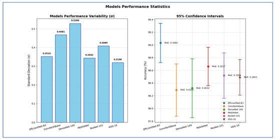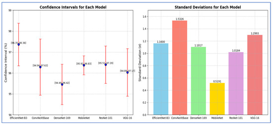 To evaluate the dependability of the results from EfficientNet-B3, a comprehensive statistical analysis was conducted. This analysis focused on the variance, standard deviation, and the CIs of the accuracy.