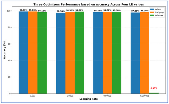 Three optimizers’ performance based on accuracy across four LR values, where the red value indicates the lowest accuracy.