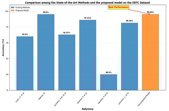 Table 16 and Figure 21 show that the state-of-the-art studies consistently demonstrated strong classification performance on the EBTC dataset, but our EfficientNet-B3 approach outperformed them all. In Table 16, the references are limited to six because the dataset proposed in 2023 is the primary focus. Lazo et al. [15] attained 90% accuracy using a semi-supervised GAN, while Yıldırım [16] achieved 99.0% with a CBIR framework. Sunnetci et al. [17] evaluated various CNN-based and hybrid DL plus ML pipelines as well as a ViT, reaching 92.57%. Sharma et al. [18] combined a CNN with a Vision Transformer to yield 97.21%, and Kaushik et al. [19] reported 80% accuracy with a conventional CNN. Lutviana et al. [20] achieved 96.29% using another CNN architecture. In contrast, our model—fine-tuned EfficientNet-B3 with five-fold cross-validation—delivered 99.03% accuracy, surpassing prior methods in both mean performance and consistency across folds.