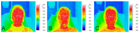 Thermograms of the subject: (A) before the procedure, (B) immediately after the procedure, (C) 20 min after the procedure.