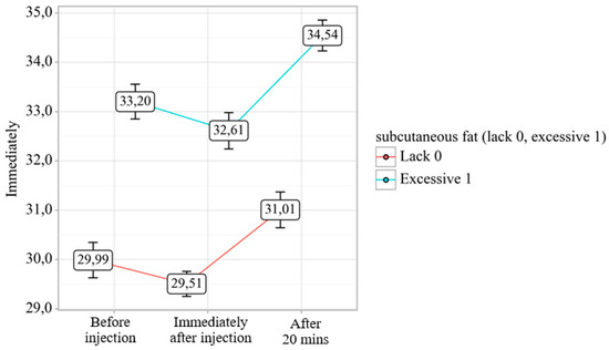 Thermographic analysis across three temporal phases—pre-injection, immediate post-injection, and 20 min post-injection—demonstrated statistically significant differential responses (p < 0.001) between cohorts with minimal versus pronounced subcutaneous adipose tissue (SAT) development (Figure 2).