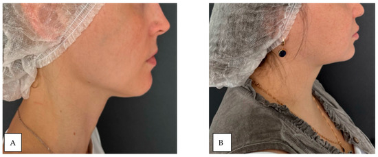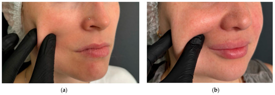 The physician evaluated the severity and uniformity of facial soft tissues in typical areas of subcutaneous adipose tissue accumulation—specifically, the cheeks, zygomatic region, and chin. Palpation was performed by gently compressing the skin and subcutaneous layer between the thumb and index finger. The central part of the cheek was selected for assessment. The thickness of the soft tissue fold, its elasticity, and resistance upon compression were determined (Figure 5). The findings were compared with average anatomical norms [44]. A two-stage classification system for assessing was applied. Mild subcutaneous adipose tissue deposition is characterized by a thin, poorly defined fold with minimal soft tissue volume. Upon compression, the skin barely forms a noticeable thickness. Pronounced subcutaneous adipose tissue deposition is characterized by a thick, clearly visible skin-fat fold with abundant soft tissue volume. The fold easily forms upon compression. To minimize subjective variability, all assessments were conducted by a single specialist.