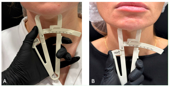 The measurement was performed using a manual caliper in the submental fat pad using a technology like traditional caliperometry. The bony edge of the lower jaw and chin were determined by palpation. Then, using the thumb and index finger of one hand, the skin fold together with the subcutaneous fat was gently grasped and slightly pulled downwards. Holding the caliper in the other hand, the ends of the caliper were placed in the middle between the base and the top of the fold, slowly pressing the thumb on the caliper platform until it clicked. After this, measurements were taken (Figure 6).
