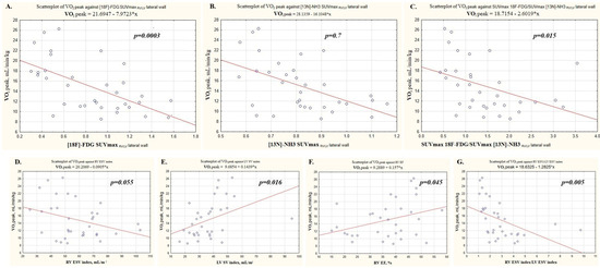 Analysis of factors associated with the aerobic exercise capacity. (A) [18F]-FDG SUVmax RV/LV lateral wall; (B) [13N]-NH3 SUVmax RV/LV lateral wall; (C) SUVmax 18F-FDG/SUVmax [13N]-NH3 RV/LV lateral wall; (D) RV ESV index; (E) LV SV index; (F) RV EF; (G) RV ESV index/LV ESV index.