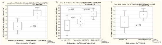 Significant differences in the SUVmax RV/LV metabolism were recorded between patients in the low and high-risk VO2 peak % predicted categories, as well as between intermediate- and high-risk categories, while the SUV max RV/LV metabolism did not differ significantly between patients in the low and intermediate-risk VO2 peak % predicted category.