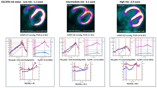Examples of low-, intermediate- and high-risk IPAH patients, presented in terms of PET/CT SUVmax RV/LV for [18F]-FDG, CPET data and hemodynamics.