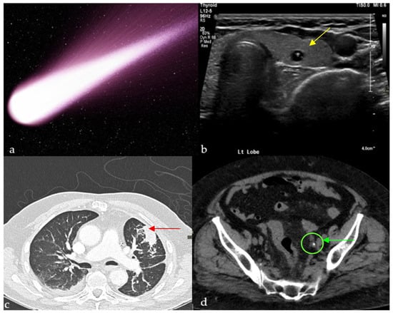 Small calcific/crystalline highly reflective structure causing reverberation artifact on ultrasound of the thyroid (yellow arrows) (b), axial CT of the chest showing a curvilinear opacity extending from a subpleural mass toward the ipsilateral hilum with distortion of vessels and bronchi (red arrow) (c), and tail of soft tissue extending from a calcification, representing the collapsed/scarred/thrombosed parent vein on a non-enhanced CT of the pelvis (green arrow) (d), all resembling a comet tail (a).