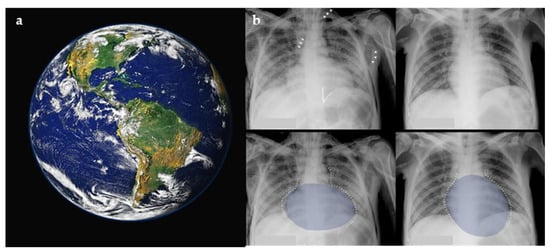 The Earth as it appears from outer space (a), with resemblance to the flattening and posterior displacement of the heart by the tension pneumomediastinum on a plain chest radiograph (b). Figure used with permission of the author G. A. O. Carillo; The Lancet, 2014 [].