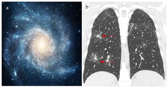 An image depicting a far galaxy (a) with resemblance to the CT view of the chest showing mass-like regions composed of numerous smaller granulomas with a central core and peripheral nodules seen in sarcoidosis (red arrows) (b).