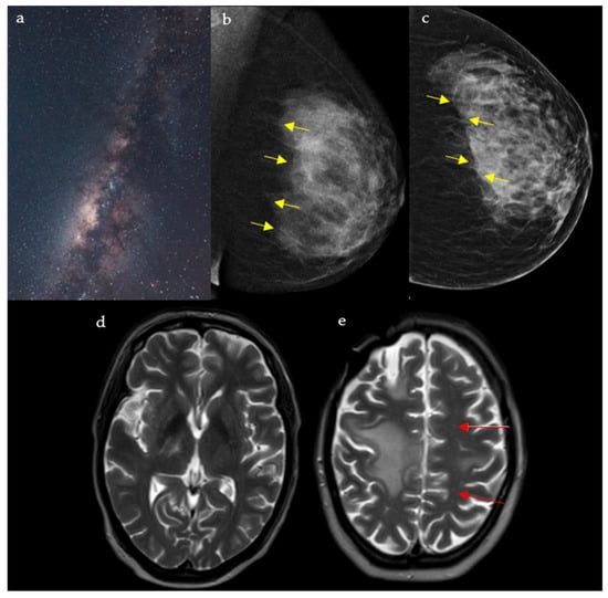 A rendering of the Milky Way galaxy as it appears from space (a), resembling the junction between the fibroglandular tissue and the retromammary fat, with an appearance analogous to that of a dark galaxy studded with stars seen on mediolateral oblique (MLO) (b) and craniocaudal (CC) (c) views of the left breast (yellow arrows). The galaxy also resembles the multiple punctate regions of high T2 surrounding the main component of the lesion in PML (red arrows) (d,e).