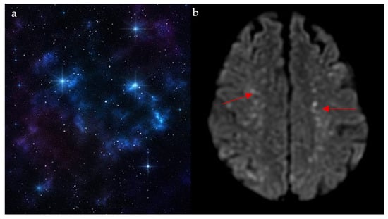 The appearance of a starfield pattern in space (a), which holds resemblance to the multiple bright foci on MR diffusion weighted images on axial cuts of the brain (red arrows) (b).