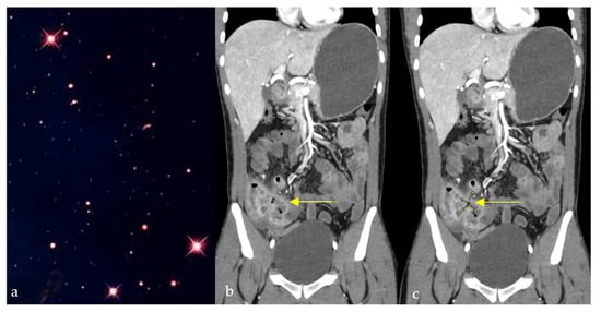 The star sign describes the pathognomonic appearance of complex entero-enteric fistulas seen in cases of penetrating Crohn’s disease resembling a shining star (Figure 7a), typically appearing as high T2 and contrast-enhanced T1 tubular structures on magnetic resonance enterography (MRE), or less frequently, on CT enterography []. It results from severe inflammation causing ulcerations and multiple fistulous tracts, causing tethering of inflamed and edematous bowel loops, giving a stellate appearance (Figure 7b,c) []. The star sign has an estimated sensitivity and specificity of 78.6% and 96.7%, respectively []. In Crohn’s patients with abdominal pain, diarrhea, or perianal drainage, a stellate cluster of enhancing fistulous tracts on MRE (“star sign”) indicates a complex fistulizing disease requiring advanced medical or surgical therapy.