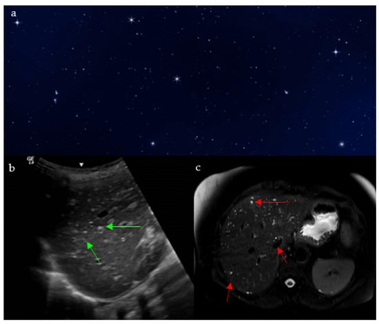 The appearance of a starry sky (a), resembling bright echogenic dots throughout a background of decreased liver parenchymal echogenicity on ultrasound (green arrows) (b), and small innumerable T2 hyperintense bile duct hamartomas and biliary microhamartomas, scattered throughout the T2 hypointense hepatic parenchyma (red arrows) (c).