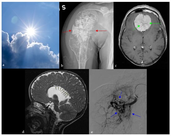 The sunburst appearance is a characteristic of meningiomas, which are one of the most common brain neoplasms. Meningiomas are often associated with headaches, seizures, focal neurological deficits, or incidental discovery, reflecting their mass effect and common presentation as slow-growing extra-axial tumors. It can be seen on angiography or brain MRI and is caused by the unique vasculature of these tumors: they are supplied by dural branches of the external carotid and vertebral arteries as well as arteries originating from the pia matter. These vessels diverge from the center of the lesion, giving the sunburst appearance on angiography, T2-WI, or after contrast administration (Figure 9c) [,].