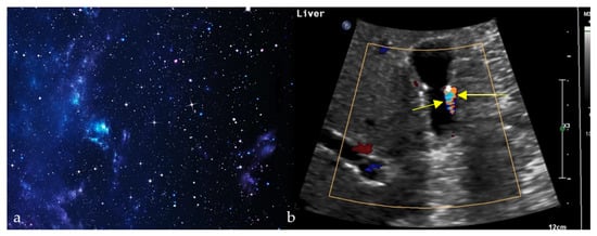 On sonographic evaluation of the liver, the starry sky (Figure 8a) appearance is indicative of acute viral hepatitis. However, it has low sensitivity and specificity, with one study reporting this sign in only 19 patients out of 791 patients with acute viral hepatitis [], as similar patterns may be seen in other systemic diseases such as leukemia, lymphoma, toxic shock syndrome, and right-sided heart failure [,], and may be even seen on normal liver scans in thin subjects []. The diffuse inflammatory disease process causes hepatomegaly with decreased echogenicity of the liver parenchyma, resulting in relative hyperechogenicity of the portal triad and accentuated brightness of the portal vein radicle walls []. This consequently gives the recognizable starry sky appearance (Figure 8b) [].