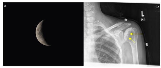 The appearance of a waxing gibbous, soon to be a crescent moon (a) resembling a linear cleft due to subchondral fracture in the setting of osteonecrosis seen on plain shoulder radiograph (yellow arrows) (b).